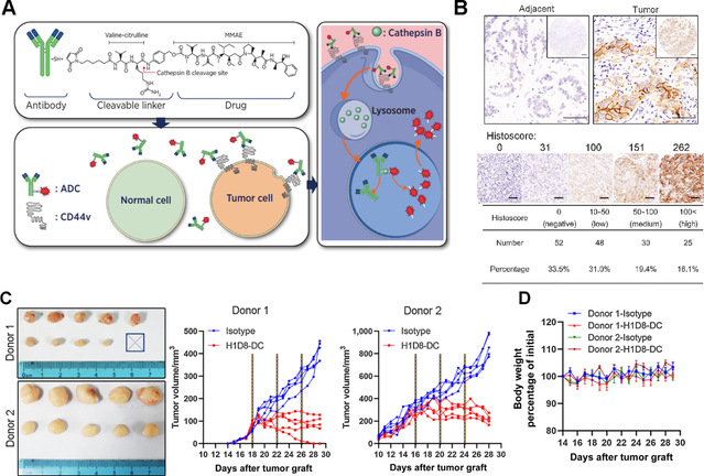 本研究通过TCGA数据库和大量临床标本分析,首先验证了CD44v5 (包含人CD44基因第9外显子的变体)在超过30 %的ICC肿瘤中特异性上调表达(图1)。后续通过一系列相关研究证实该异构体的潜在靶标功能。基于这些研究,开发了一种适用于ADC方法的人源化抗体,该抗体兼具靶标特异性、亲和力以及良好的靶细胞内化功能;通过可切割的缬氨酸-瓜氨酸接头(被Cathepsin B特异性降解)将人源化CD44v5单克隆抗体连接到微管抑制剂单甲基auristatin E(MMAE)上,构建了一种靶向CD44v5的ADC(H1D8-DC)(图1)。该新型H1D8-DC在细胞表面表达CD44v5的细胞中表现出高效的抗原结合和内化。由于Cathepsin B在ICC细胞中高表达,药物在癌细胞中优先释放,而在正常细胞中不释放,因此H1D8-DC在皮摩尔浓度下具有较强的细胞毒性。运用小鼠肿瘤模型进行的实验数据显示:H1D8-DC靶向CD44v5阳性的ICC细胞,在患者来源的异种移植模型中,抑制肿瘤进展。同时未观察到明显的毒副作用(图1)。研究证明:CD44v5具备成为ICC治疗靶点的潜能,H1D8-DC具有临床转化前景。