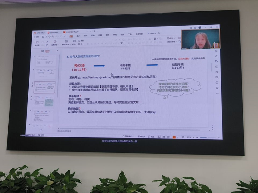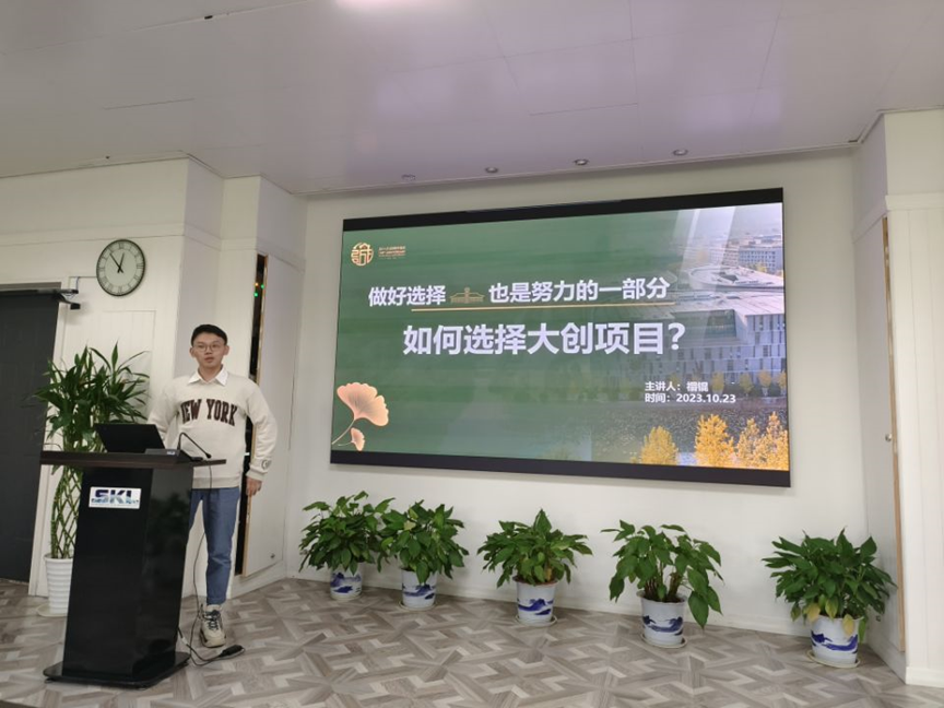 在分享会中,2020级孙淏钰同学引导学弟学妹们明确参与大创的目的,理清大创的流程与每个关键节点需要做的事情,在一些细节如联系导师、确定选题方面进行了深入的阐述,并对关于是否要参加大创、可能存在的问题等方面也进行了讲解。