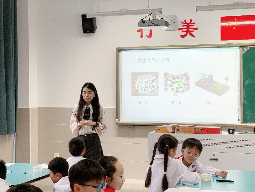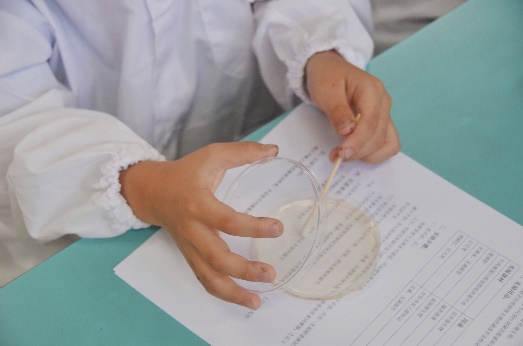 发言结束后,陈艳老师总结了微生物的种类,并进一步解释了不同种类微生物的特征。随后,助教老师给同学们分发试剂、棉棒和已经倒好培养基的培养皿,指导同学们将洗手前后手上的微生物接种到培养基上。最后给接种完成的培养皿标记好序号和日期,让同学们将其带回家观察,并填写实验报告。