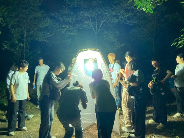 抵达实习基地简单休整后,大家就在高贤明老师、赵雨梦助教的带领下热情高涨地开始观测实习基地周边的鸟类和植物多样性,傍晚时分的余晖烧红了西边的天空,预示着本次实习将会是一个愉快和收获满满的学习之旅。师生们在驻地附近架起了两个诱虫帐篷,当500瓦的卤素灯亮起时,同学们已翘首期盼昆虫们的造访。夜色缓缓降临,各色各样的昆虫开始飞进灯帐,同学们深深沉浸在昆虫资深爱好者海鹦对昆虫生活习性等知识的生动讲解中。