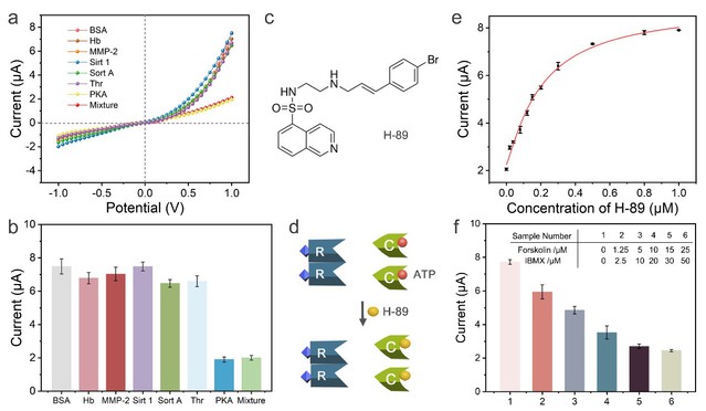 为了进一步验证他们所研制的生物传感器的性能,研究团队进行了一系列实验证明其具有良好的特异性与抗干扰性。他们还通过对PKA抑制剂的预处理实验证明了生物传感器在筛选PKA抑制剂方面的潜力。最后,研究人员发现该生物传感器在体外测定细胞裂解液中PKA活性方面表现出色(图3)。