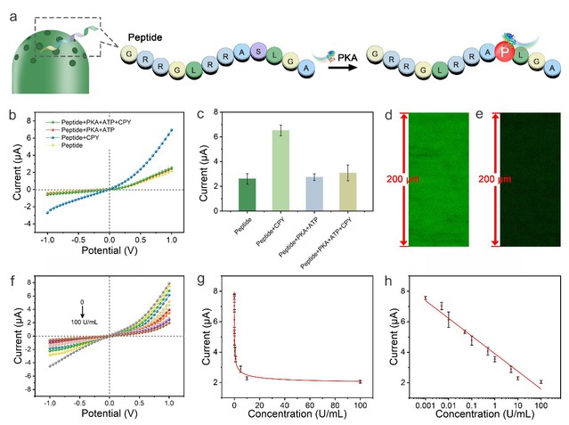为实现PKA的灵敏检测,并鉴定其抑制剂或激活剂,以推动疾病早期诊断及发现潜在的激酶靶向药物,研究人员进一步通过将多肽序列RRASLG嵌入响应肽作为PKA的识别底物,成功研发了一种操作简便、无需标记和低成本的高灵敏生物传感器。研究结果表明,通过氧化石墨烯和多肽之间的相互作用,离子门能够特异而高效地响应磷酸化,并将位阻差异转化为PKA分析的离子电流。此外,在+1 V时纳米通道中的电流值与PKA浓度之间呈线性相关,实现了对PKA的精准定量检测(图2)。