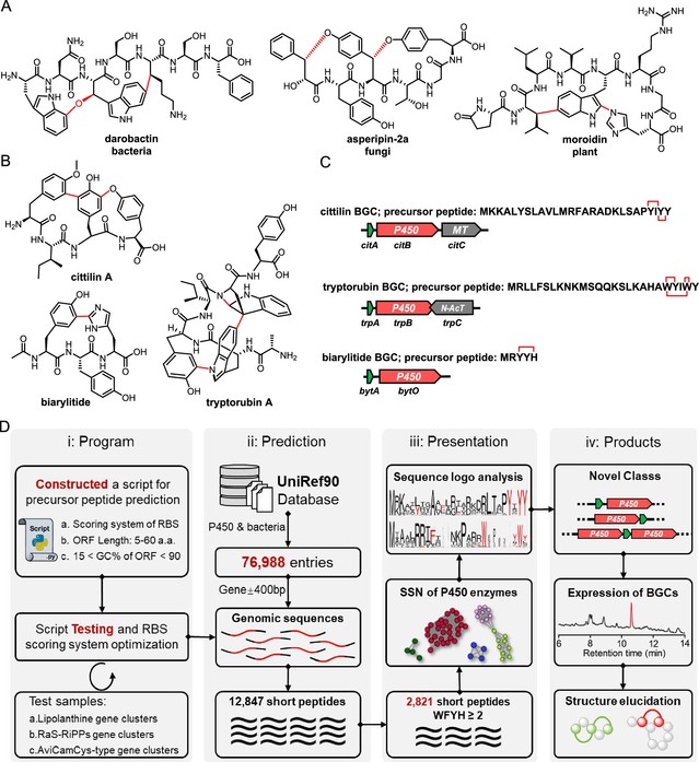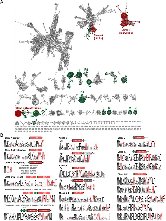 近年来,P450酶被报道可以催化前体肽中芳香氨基酸侧链间的交联成环(图1B, C),形成的环肽产物称之为P450酶修饰RiPPs。为了进一步拓展该类环肽分子的化学多样性,该团队利用生物信息学手段对细菌展开了基因组挖掘。由于P450酶数量众多,且前体肽基因难以预测,该团队从头建立了一个简便高效的基因组挖掘流程(图1D),从UniRef90数据库中收集了76,988条P450酶基因及上下游400bp的非编码区序列,利用预测程序,获得了12,847条短肽序列(图1D)。再以短肽序列C端区域是否富含芳香氨基酸,从中筛选到2,648个对应的P450酶,通过这些P450酶构筑的序列相似性网络和对应的前体肽序列保守性分析,该团队一共发现了16个P450酶修饰RiPPs的不同类别(图2,类别A-P),较为完整的揭示了该类环肽产物在细菌中的全局性分布。