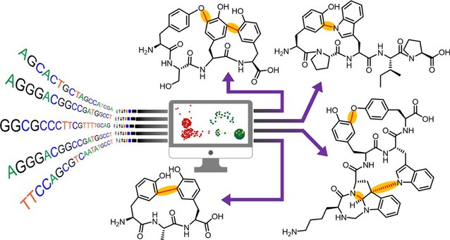 总而言之,该研究通过从头编写前体肽基因的识别程序并组建一套简便高效的基因组挖掘流程,描绘了P450酶修饰RiPPs的全局蓝图,并通过多个新颖环肽产物的表征,证实了该类环肽产物巨大的结构多样性潜能。这项研究为环肽天然产物的发现提供了新的视角,并为环肽药物的人工合成提供了新的思路和酶学工具。