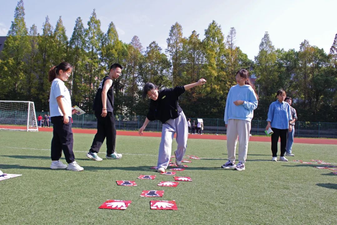 “手忙脚乱”要求按地面标志手脚并用到达终点,考验协调平衡;“呼啦圈传递”两个方向同时手拉手传递呼啦圈,强调灵活和团队协作;“指压板传话”和“沙包躲避”则紧张刺激,要求反应和默契……