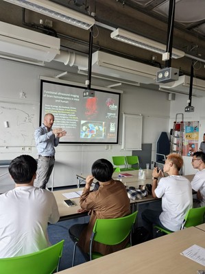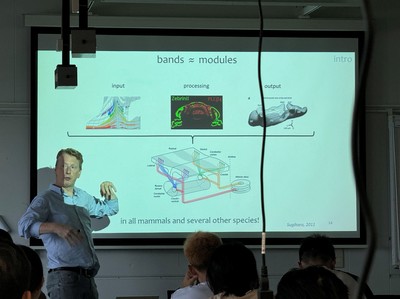 Pieter Kruizinga教授详细阐述了他们如何利用高分辨超声技术在脑血流动力学和脑肿瘤手术中的作用和应用。Kruizinga教授的讲解让晦涩的高分辨超声原理通俗易懂。他们通过将单点扫描的传统策略转化为多通道扫描的新型策略,并在后期用算法处理获得高分辨超声结果。在进行超声技术和分析算法的不断突破之余,他们还将超声血流分析结果与人脑外科手术中的脑区功能精确鉴定联系在一起,从基础科学研究走向临床实践应用,让同学们深深领略了脑科学与工程技术领域结合的魅力。