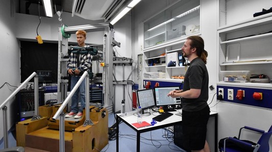 在参观实验室的过程中,最受欢迎的当属研究运动平衡和能耗协调神经机制的Leeuwis博士的实验室。他们实验室成员自己搭建的仪器——可调节的人体平衡仪是本次科考中最有趣的实验仪器之一。科考队员们站在仪器上,体验姿势平衡的同时对神经系统的运动平衡调控有了更加直观的感受和深入的认识。