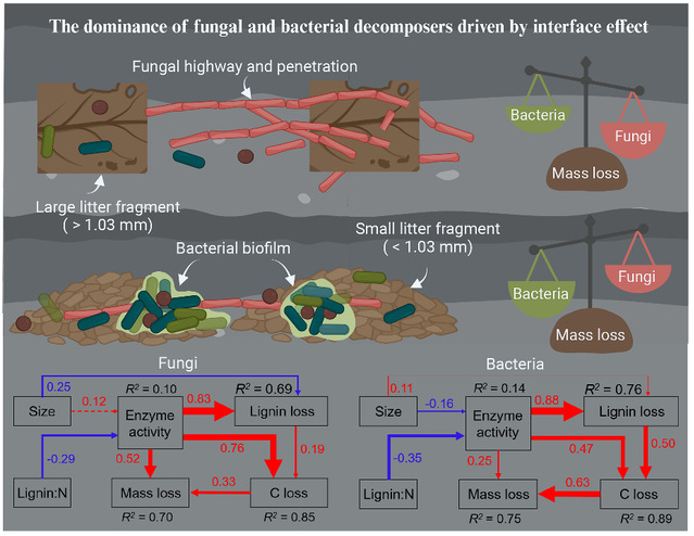 综上,凋落物尺寸调控真菌和细菌的分解活动(图3)。大尺寸凋落物的物理屏障是限制细菌分解活性的最重要因素。本研究强调,考虑到界面效应,细菌在凋落物分解中的作用被严重低估。与化学特征相比,凋落物的物理学特征是未来深入了解真菌和细菌在分解过程中作用的关键。