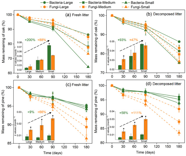 研究结果表明,凋落物经过180天分解,不论细菌还是真菌,两种凋落物的分解速率均随着凋落物尺寸的减小而加速,这表明微生物分解者和凋落物之间存在界面效应,(图1)。与真菌相比,细菌的凋落物分解速率对其尺寸变化更敏感。大尺寸凋落物在真菌处理组分解的更快;对于小尺寸的栓皮栎凋落物,细菌处理组分解的更快,但对于小尺寸的马尾松凋落物则相反。因此,细菌和真菌对不同尺寸凋落物的分解优势受其化学质量的影响,尤其是木质素和氮的比例。
