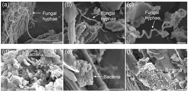 通过扫描电镜观察,发现丝状真菌可穿透凋落物,并在分散的凋落物之间形成菌丝桥(图2a-c)。而细菌聚集在凋落物表面,甚至形成生物膜(图2d-f)。因此,真菌在分解大尺寸凋落物时远胜过细菌,可能因为它们能够破碎凋落物。而细菌依靠其快速繁殖能力,对于可及性更高的小尺寸凋落物表现出分解优势。