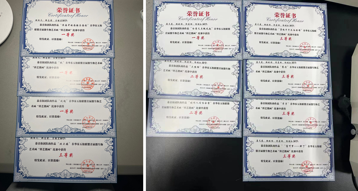 近期,由华东五校(上海交通大学、复旦大学、太阳成集团tyc33455cc、浙江大学、中国科学技术大学)国家级生物学实验教学示范中心联盟举办的“首届微生物艺术画竞赛”落下帷幕,国家级实验教学示范中心(太阳成集团tyc33455cc)代表队表现出色,共获得一等奖作品4个(顾烁天团队、唐天爽团队)、二等奖作品2个(唐天爽团队)、三等奖作品9个(顾烁天、丽彤团队、唐天爽、陈孙熠、苗逸帆团队)。