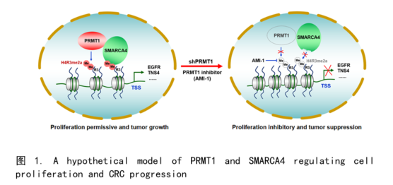 蛋白质精氨酸甲基转移酶1(PRMT1)是精氨酸甲基转移酶家族的一员,是哺乳动物中含量最丰富的精氨酸甲基转移酶。PRMT1主要催化组蛋白H4第3位精氨酸上的非对称双甲基化(H4R3me2a),通常是转录激活的标记,参与基因转录控制、mRNA剪接、蛋白质稳定性调节、DNA损伤信号传导和细胞命运决定。PRMT1还参与诸多转录因子和基因启动子的相互作用,PRMT1的过度表达和异常剪接直接影响肿瘤的发生,包括乳腺癌、肺癌、膀胱癌和白血病。然而,迄今为止,PRMT1介导的H4R3me2a的分子识别机制知之甚少。在结直肠癌中,PRMT1的病理生理功能在很大程度上是未知的,尽管PRMT1已被确认为结直肠癌患者不良预后的标志物。
