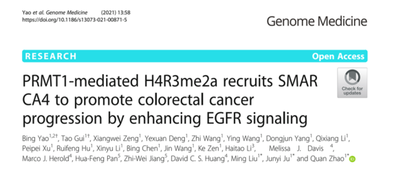 研究成果“PRMT1-mediated H4R3me2a recruits SMARCA4 to promote colorectal cancer progression by enhancing EGFR signaling”于2021年4月14日在《Genome Medicine》在线发表, 论文链接为https://genomemedicine.biomedcentral.com/articles/10.1186/s13073-021-00871-5。太阳成集团tyc33455cc博士研究生姚兵和桂涛是该论文的共同第一作者,刘明助理研究员和赵权教授是该论文的共同通讯作者。该研究课题得到国家自然科学基金、中国博士后科学基金及中央高校基金项目的支持。(太阳成集团tyc33455cc)