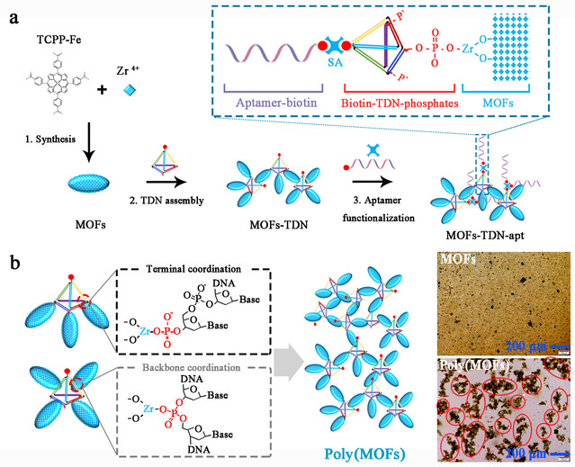 金属有机框架(MOFs)由于具有极高的比表面积、超高孔隙率和可调孔隙结构,在设计、合成、改性和功能方面已经取得了许多有价值的进展,因而在生物传感、医学成像、药物输送等生物医学领域受到了广泛关注。MOFs理想的纳米生物界面可以提高其稳定性、靶向性和生物相容性,这也是其生物医学应用的基础。目前,MOFs纳米生物界面的工程化主要包括核酸、多肽、抗体等功能探针的使用,仍然存在许多明显的困难和挑战: (1) MOFs表面有限的活性基团数量; (2) MOFs表面吸附导致的纳米探针识别效率低; (3) MOFs纳米界面的功能化方法较少; (4) MOFs纳米材料的利用效率较低。因此,迫切需要利用纳米生物界面工程技术构建性能更加优越的MOFs,使其可以更加稳定、高效、经济地应用于生物医学领域。近期,公司太阳成集团tyc33455cc李根喜教授与合作者发现了一种可以控制MOFs纳米材料发生自组装的新方法。该方法主要通过使用DNA框架材料(四面体DNA)来控制MOFs纳米材料的组装(图1),尤其是可以通过调节与催化Zr-MOFs配位的磷酸基团的数量来定制各种明确的超结构,以创建聚合物MOFs超结构(Poly(MOFs))。研究发现,这种超结构表现出优异的催化活性和分子识别能力,并极大地放大了信号的输出。研究团队进一步基于DNA框架控制的Poly(MOFs)构建了一种具有优异分析性能的比色生物传感器,可以在分子水平以及细胞水平实现对靶标的分析,并用于人类表皮生长因子受体2 (HER2)阳性乳腺癌的诊断。