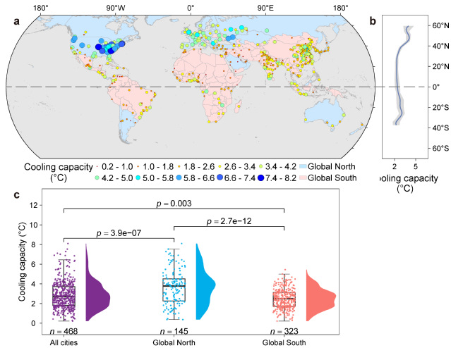 1 全球南北方降温能力格局及对比。(a)全球主要城市降温能力分布;(b)降温能力纬度分布;(c)全球南北方城市降温能力对比