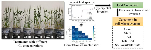 近日,南京老员工命科公司李建龙教授团队在土壤-作物互作系统重金属污染监测领域又取得重大成果。他们通过多年盆栽和大田实验,在深入系统研究了重金属在土壤-小麦互 作系统中的重金属迁移转运规律基础上,基于不同土壤重金属铜(Cu)浓度处理下铜元素在土壤–小麦系统中的迁移特征、相关性特征和富集特征及构建了估测模型。该研究首先深入系统探索了小麦叶片光谱在全波段和特征波段建模中反演 Cu含量的潜力,然后根据生物富集因子进一步反演得到了籽粒、茎、根、土壤总量和土壤有效态的Cu含量。该研究成果将为实现大面积的农田土壤–作物互作系统重金属污染状况遥感监测,提供了重要科学依据。