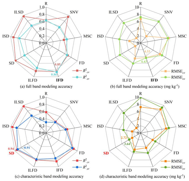 该研究深入系统的探索了基于高光谱技术和生物富集因子的土壤-小麦互作系统Cu 含 量的反演潜力和规律。研究结果表明小麦叶片与土壤 Cu 总量、根、茎的 Cu含量相关系数 都在 0.95 以上,这为利用小麦叶片反演土壤和小麦不同部位的Cu含量提供了支撑;大部分经过预处理的光谱相较于原始光谱反演精度都得到了不同程度的提升,并且特征波段建模总体上优于全波段建模;此外,生物富集因子分组反演优于平均值生物富集因子反演特性。其中,茎和根的R2cv和R2ev都超过了0.90,土壤总量的R2cv和R2ev都超过了0.85,土壤有效态的R2cv和R2ev都超过了0.70(图2)。未来可以进一步将该研究思路和方法在大面积农田土壤-作物重金属含量监测中进行研究和应用,实现土壤-作物互作系统重金属污染大面积遥感监测和预警,这将有利于维护粮食安全。