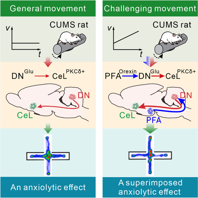 课题组进一步探究了何种运动范式能够更有效地改善焦虑。他们先前的系列研究工作表明,下丘脑神经肽促食欲素(orexin)在介导挑战性运动(challenging movement)(Neuron, 2011)和抗应激韧性(stress resilience)(Molecular Psychiatry, 2019)中发挥关键作用。有趣的是,在本研究中,他们构建了orexin-cre大鼠,并发现下丘脑穹窿周区(PFA)中具有直接支配小脑DN的orexin能神经元,且这些神经元与直接支配杏仁核的orexin能神经元分属不同亚群,而挑战性加速rotarod跑步机运动能够选择性募集那些直接支配小脑DN的orexin能神经元,进一步兴奋和驱动DN-CeL投射,从而对慢性不可预知温和应激(CUMS)诱导的焦虑模型大鼠产生更强的抗焦虑效应。提示PFA-DN-CeL三元神经环路很可能像多档位变速箱和发动机一样工作,能够在两个强度水平上介导运动对焦虑的改善效应(图1)。
