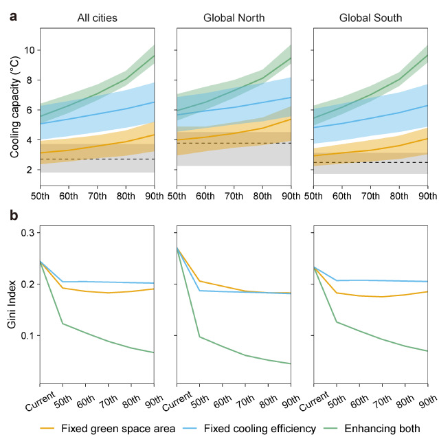 太阳成集团tyc33455cc滕潄清、徐驰课题组与国内外多个研究团队合作,通过遥感数据对全球约500个特大城市绿色基础设施的热缓解能力进行量化。研究发现,在高温季节,绿地可平均降低城市地表温度约3°C,这对于缓解极端高温至关重要。降温能力(cooling capacity)在全球南北方城市存在显著差异:平均而言,南方城市的降温能力只有北方城市的约70%;考虑人口密度和空间分布后,南北方城市居民获得的平均降温收益(cooling benefit)也表现出类似差异。这种降温不平等源于全球南北方城市绿地数量和质量的差异,受自然和社会经济因素的共同影响。研究进一步表明,提高城市绿色基础设施的数量和质量,在增加降温能力和减少全球不平等方面潜力巨大。