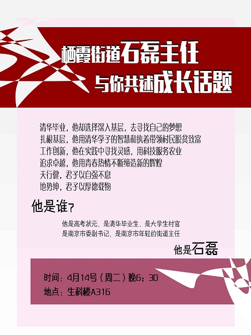 4月14日(周二)晚6:30,清华大学毕业生,老员工村官,南京市团委副书记,栖霞街道办主任石磊来啦!生命科公司A316,石磊将和大家共同聊聊成长的话题,期待你的到来。详情见如下海报: