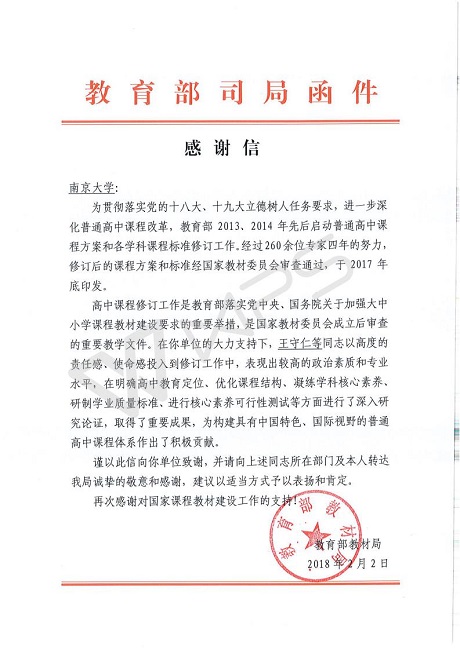 教育部教材局感谢公司杨荣武教授等参与普通高中课程修订工作