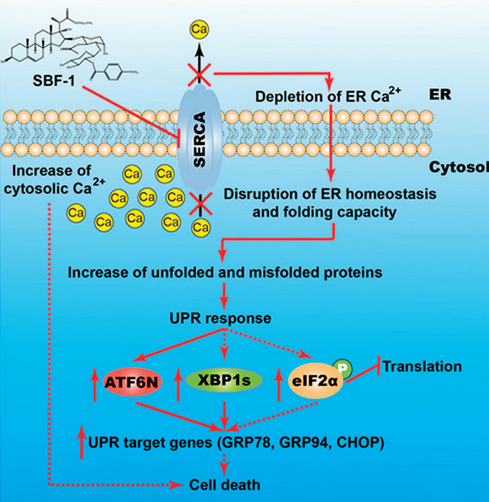 Ilustration for the mechanism underlying the anticervical cancer effects of SBF-1. When cells are exposed to SBF-1, SERCA activity is suppressed, inducing depletion of ER Ca2+ and increase of cytosolic Ca2+, which disturbs ER folding capacity and increases unfolded and misfolded proteins, activating the signaling pathways of UPR response and causing ER stress-associated cell death. ATF6N, N terminal of ATF6α