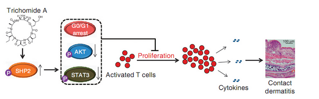 通过对接触性过敏反应小鼠模型的研究,人们已经揭示出很多有关接触性过敏皮炎的发病机制,并且相关研究也提出了很多针对这类疾病的潜在性治疗策略。变应性接触性皮炎是由T细胞介导的迟发型超敏反应,T淋巴细胞过渡活化与接触性过敏皮炎的发生有十分密切的关系。在临床应用中,环肽类药物环孢菌素A通常被选择用于治疗由于T淋巴细胞过度活化而导致的疾病。我们从Trichothecium roseum发酵代谢产物中分离得到的新型缩酚酸环肽Trichomide A对T细胞活性的抑制能更针对那部分已活化的T细胞,较环孢菌素A具有更好的选择性抑制作用。环孢菌素A对T细胞具有很强的活化抑制作用,而Trichomide A不影响T细胞的活化过程,这暗示它们对T细胞抑制作用的机制可能不同。进一步发现Trichomide A能诱导活化T细胞中SHP2蛋白的磷酸化水平和酶活水平升高。通过多种实验方法和借助T细胞SHP2条件性敲除小鼠研究表明,Trichomide A 能通过调控 SHP2而抑制活化的T细胞达到治疗接触性皮炎的效果。该研究成果为治疗此类相关疾病提供了潜在的治疗靶点并阐明了靶点调控方式,此外还发现了备选化合物天然新型缩酚酸环肽Trichomide A。