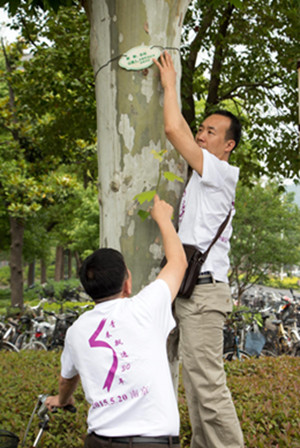 下午2点,二十多位员工统一穿着纪念毕业30周年的白色T恤衫,到达仙林校区。员工们认领捐赠中央大道东侧的第一棵梧桐树,在母校学子林中留下自己年级的名字。大家合力为高大茂盛的梧桐树挂上认领牌,并兴致勃勃地与大树合影,相约10年后再来树下共叙青春回忆。