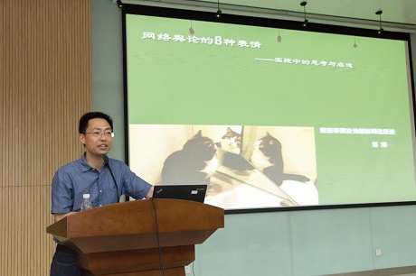 潘处长通过展示“南京父母虐童事件”、“秦淮区两车相撞事件”等一些真实事件引起的舆论风波和网络上转载量极高的几组热点图片,结合自身舆情应对和处理的实际工作经验,与在座师生分析和探讨了网络舆论中的8种表情――气愤、怀疑、好玩、相信、无奈、得瑟、疑惑和委屈,并通过角色模拟的方式启发观众们换位思考,以便大家能够更加理性客观的看待网络舆情事件的。