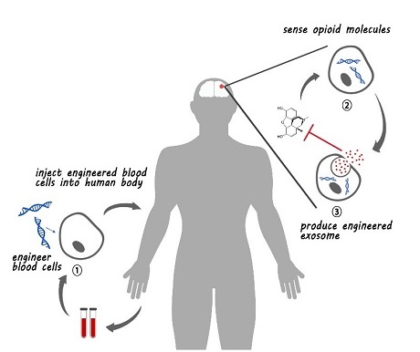 NJU-China队伍项目“阿片战争”(the OpioidWar)运用经修饰的外泌微囊泡(exosome)包裹的小干扰RNA(small interfering RNA, siRNA)作为药物,靶向血脑屏障(BloodBrain Barrier, BBB)内的神经元细胞,下调其细胞膜表面μ受体(μ receptor)的表达量,从而达到防止阿片类毒品复吸的目的。