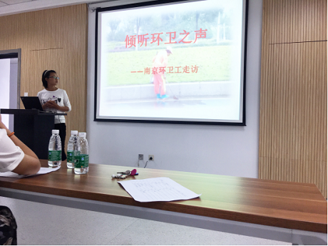 首先出场的是南京环卫工走访团队,他们的选题名为《倾听环卫之声》。基于环卫工生存环境窘迫的现状下,团队从管理层面下手,实地参观,深入了解环卫工人的用餐地点及简陋的工作设施。同时,团队成员也通过实践了解到环卫工这项职业存在年龄偏大、福利待遇低等问题,可谓是下基层,入群众。