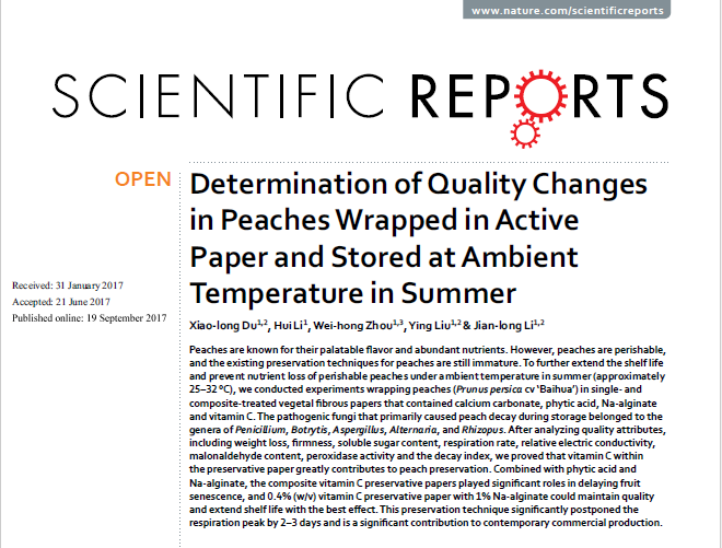 生命科公司李建龙教授实验室在食品安全生态保护领域取得重要实用性成果,他们以张家港凤凰水蜜桃为研究对象,经多年实验室及大田试验与论证后,参考国内外相关重要生理生态指标,结合微生物检验技术与生物工程制备技术,自主研发了可在夏季常温下有效抑制水蜜桃果实采后腐烂、病害发生的维生素C复合保鲜纸,其应用效果显示能有效延长水蜜桃保鲜期和货架期,从而有效解决了水蜜桃采后难于保鲜与贮运关键技术,这一世界难题,为我国今后发展农业食品工业,促进农业发展和农民增收,提高食品安全,提供了关键技术支持与保鲜产品。该成果“Determination of Quality Changes in Peaches Wrapped in Active Paper and Stored at Ambient Temperature in Summer”(http:// https://www.nature.com/articles/s41598-017-09221-1)为题在《Scientific Reports》发表,第一作者为杜小龙博士,通讯作者为李建龙教授。