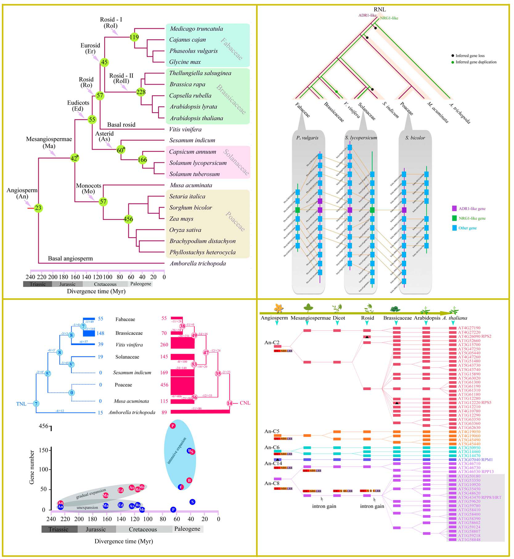 在该论文中,团队研究人员对植物最大的一类抗病基因――NBS-LRR基因在被子植物中的演化模式进行了研究。通过对22个被子植物基因组中鉴定出6000多条NBS-LRR基因进行系统演化分析,提出了NBS-LRR 基因划分的新体系;从被子植物演化尺度上揭示了该类基因的演化历史、演化模式及机制。结果发现:1NBS-LRR基因包括三个古老的亚类TNLCNLRNL作为参与抗病信号传导的基因,RNL呈现出保守演化特征;而直接参与病原识别的TNLCNL基因则展现出不同的扩张模式;2在白垩纪和第三纪过渡期(K-P boundary的真菌爆发可能是NBS-LRR基因剧烈扩张的一个重要诱因;3)对功能基因演化历程的追溯揭示了植物与病原间的长期军备竞赛