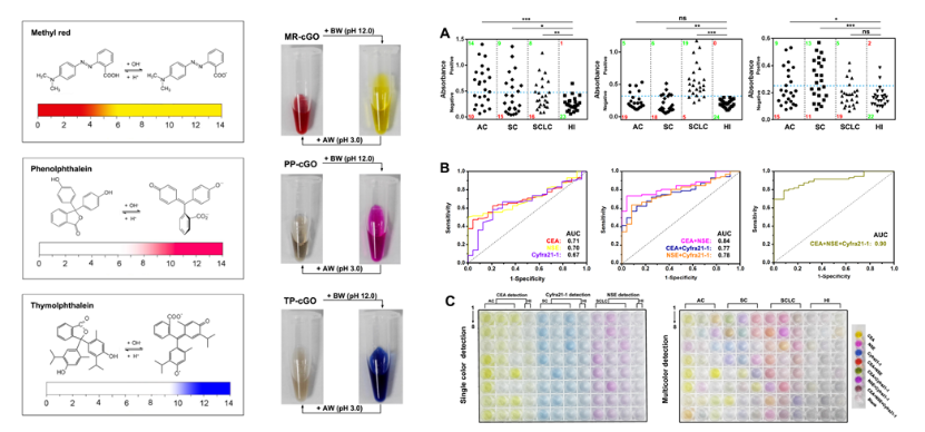 近期,国际著名期刊【Chemical Science】以封面文章发表了公司太阳成集团tyc33455cc李根喜教授课题组在生物分子工程及临床检验应用方面的一项成果,并且被作为热点论文加以介绍。酶联免疫分析是生物医学研究及临床检验中最常用的技术手段,但存在检测信号单一、检测灵敏度较低等问题。李根喜教授课题组首次实现了酶联免疫分析的同时多色检测,极大地弥补了传统酶联免疫测定中效率低下的问题,并且证实了联合分析病人血清中三种肿瘤标志物,可以显著提高肺癌的检出率,为癌症的早期诊断和对症施治提供了非常有益的信息。在这一工作中,他们通过将抗体分子修饰在富含羧基的石墨烯边缘,然后再通过π-π相互作用和疏水作用力将多种变色分子如孔雀石绿、甲基红、酚酞、百里酚酞分别吸附到石墨烯表面,从而制得多种pH响应的变色纳米探针,因此实现了多种肿瘤标志蛋白的多色分析。相关成果以“Improvement of enzyme-linked immunosorbent assay for the multicolor detection of biomarkers”为题发表于【Chemical Science, 2016, 7, 3011-3016】。