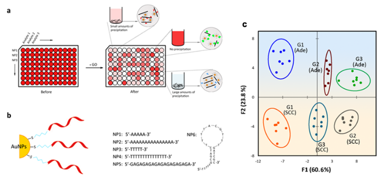 图3:基于ssDNA-GNPs-GO体系的比色阵列用于肺癌分型与分期的鉴别。