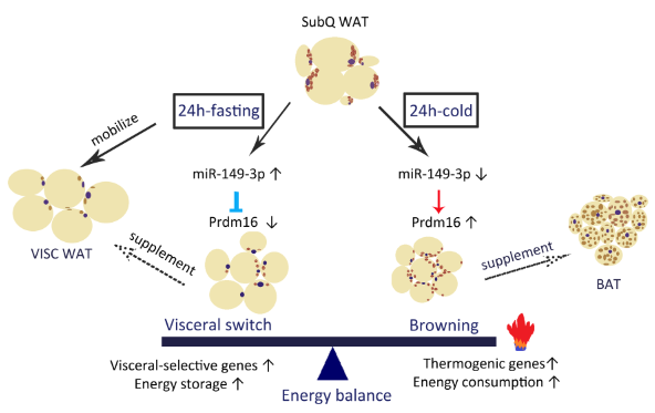 Fig.1. 不同生理条件下miRNA-149-3p调控皮下脂肪褐色化/内脏化