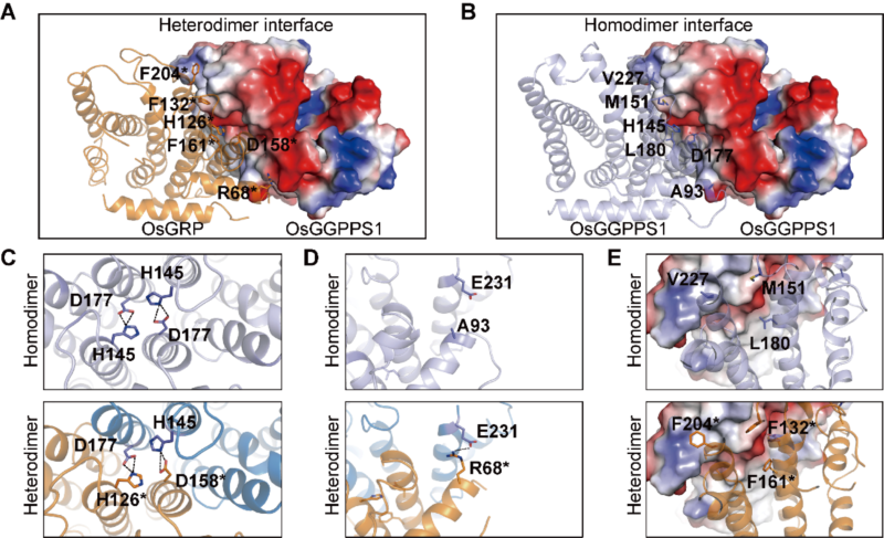 A. GGPPS/GRP异源二聚体结构及界面氨基酸组成。B. GGPPS/GGPPS同源二聚体结构及界面氨基酸组成。C. GGPPS的H145及D177以及GRP中对应的H126*和D158*是形成二聚体所必须的。D. GRP中R68*比GGPPS中对应的A93更有利于二聚体的结合。E. GRP中F132*、F161*、F204*比GGPPS中对应的M151、L180、V227更有利于二聚体的结合。