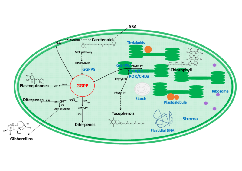 叶绿素是最重要的有机化合物。关于叶绿素的合成研究多集中在其卟啉环的代谢过程,而对其植烯侧链的供应了解很少。植烯来自于叶绿体中的GGPP,但是GGPP同时也是植物三种激素(赤霉素、脱落酸、独脚金内酯)以及类胡萝卜素等重要生理物质的合成前体(图1)。这些合成过程分布于叶绿体的基质和类囊体等不同区室中。植物如何精确调配GGPP供应,以同时满足不同物质的合成,始终令人困惑,也是很多代谢调控工作无法绕过的问题。