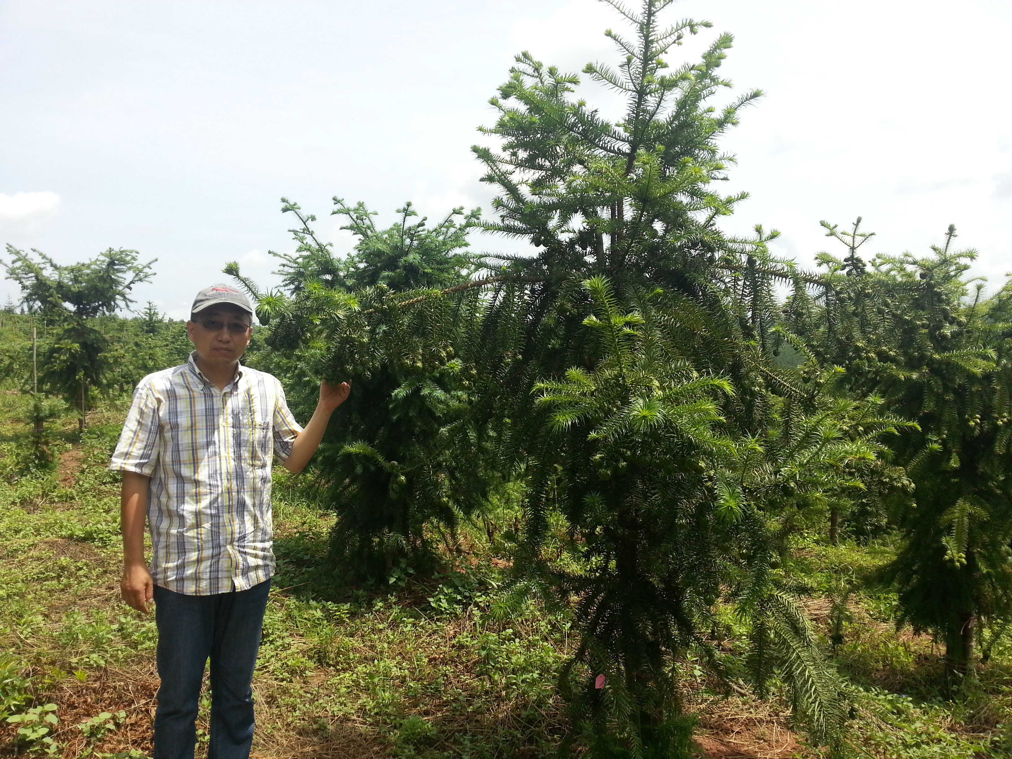 图3 何祯祥副教授在龙山林场高产杉木种子园查看开花情况(2016)