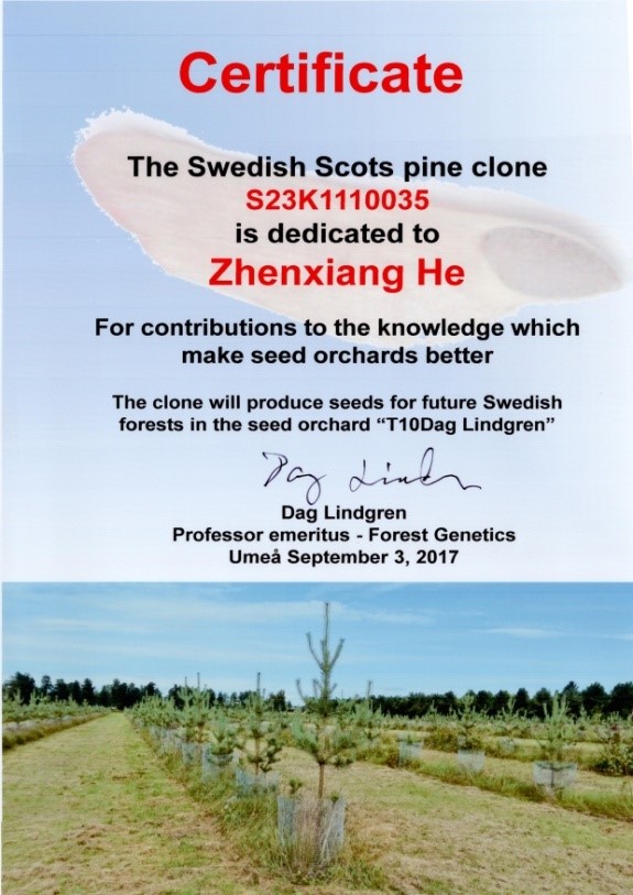太阳成集团tyc33455cc何祯祥副教授课题组、广东省林业科学研究院以及广东省乐昌市龙山林场研究团队运用自身在中国南方重要造林乡土树种―杉木多世代遗传改良研究领域的多年积累和经验,创新性提出新概念杉木种子园的建园技术,在种子园设计、亲本选择与配置、定向施肥与控高技术等方面经过12年坚持不懈的研究和试验,杉木种子园高产稳产技术终于获得了突破性进展。从2010年到2016年,杉木种子园种子产量年年高产。2016年度精选高效种子园种子产量最高产量达到187.5 kg/ha,是林木种子园平均产量的12.5倍;小面积测试的单系杉木种子园种子产量产量最高达570 kg/ha,是世界林木种子园平均产量的38倍。2017年9月3-7日在瑞典召开的国际林联种子园大会上何祯祥副教授代表课题组应邀做了大会发言,并获得由瑞典林木育种界老前辈著名遗传育种学家Dag Lindgren教授颁发的荣誉证书,该项成果得到国际上的肯定和认可。