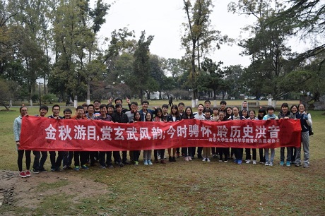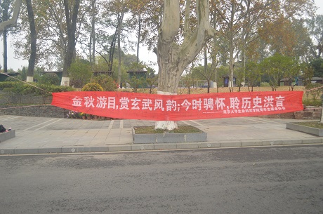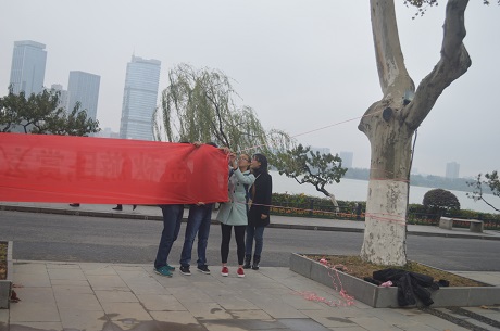 中午十二点,展台小组为了布置现场,便作为先锋部队率先向玄武湖进发。来到展台预先定好的湖边位置,小部员们便在副主席和实践部两位部长的带领下开始动手布置展台啦!