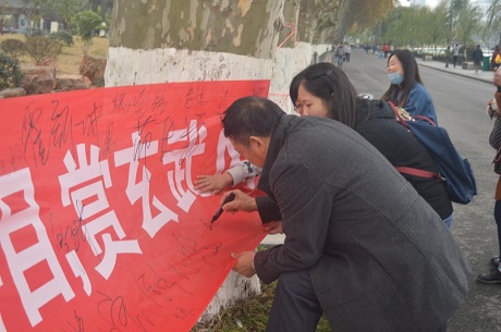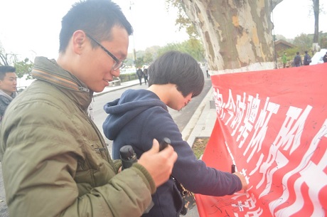 下午在部员们对游人热情地介绍与号召下,横幅被密密麻麻的签名所覆盖,游人的支持令全体展台组员格外振奋!