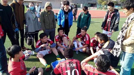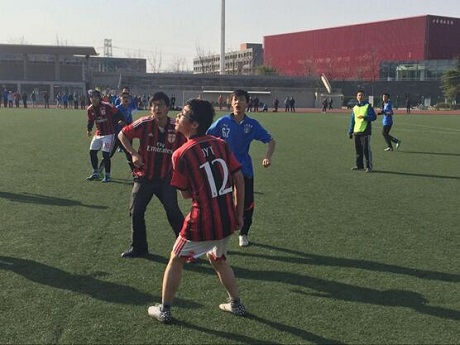 易地再战,两球领先的生科君踢得并不保守,反而延续了上半场进攻的势头,在前场多次获得角球机会,可惜未形成有威胁的进攻。而化院利用后卫的大脚解围也迅速形成反击,给生科球门造成威胁。第33分钟,程九清在拼抢中吃到一张黄牌,而化院开出的任意球直接飞向了场边观众。此后双方对球权的争夺异常激烈,很快生科在前场左路获得任意球机会,卡梦然一记劲射,皮球划出一道漂亮的弧线后擦着立柱飞出场外。之后化院由中场逐渐推进,铁甲王侃的一次次漂亮解围化解了一个又一个威胁。而在右路李伟也死死的防住了化院21号前锋,阻挡住了化院的攻势。然而,生科的防线在比赛末端出现了极大的危机,第45分钟,化院通过巧妙的传球险些撕开后防,铁腰程九清当机立断化解了对方最有威胁的一次单刀,无奈再一次吃到黄牌,而化院发出的任意球直接飞出了场外。生科被罚下一人,但铁肺王鑫的活跃表现弥补了这一遗憾,他来回穿梭在球场各个方位,一次次让化院的进攻化为泡影。补时阶段,化院全线压上,连门将也在前场作战。但在生科铜墙铁壁般的防守下并未取得成效。随着生科门将出击将球击出,主裁吹响了终场哨。紧绷的神经终于放松,生科男足以两球优势力克化院杀入决赛。