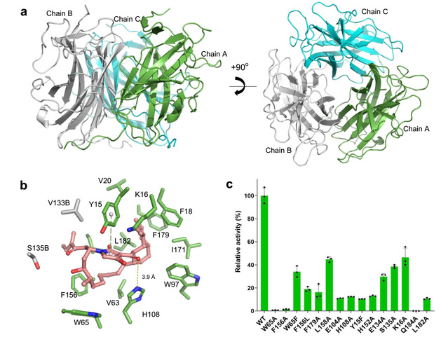 随后的生物信息学分析发现,无论是一级序列还是三级序列,在数据库中都未找到任何蛋白与AvmM相似。为进一步了解AvmM的催化过程,通过在蛋白中引入硒代甲硫氨酸确定相位,最终得到了AvmM2.09 Å)及AvmM-22.5 Å)复合晶体结构,发现AvmM以几乎仅由β折叠组成的同源三聚体形式存在。