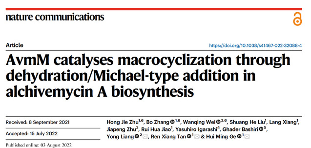 近期,该项工作以“AvmM catalyses macrocyclization through dehydration/michael-type addition in alchivemycin A biosynthesis”为题,发表在Nature Communications上,太阳成集团tyc33455cc朱宏杰博士、张博副教授和化学化工公司魏婉清博士为文章共同第一作者,太阳成集团tyc33455cc戈惠明教授、谭仁祥教授和化学化工公司梁勇教授为文章通讯作者。该项研究工作得到国家杰出青年基金、国家重点研发计划等项目的资助。