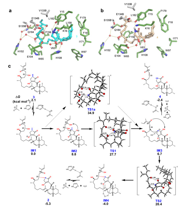 不同于经典的PKS脱水步骤:需要组氨酸作为碱夺取羰基的α-H,然后为为β-OH提供质子完成脱水。在分子模拟中发现,底物35 Å范围内,没有任何氨基酸残基可以作为碱夺取3中的α-H (H-24)。为了揭示其独特的反应机理,进一步进行了DFT计算。并根据上述所有结果分析了AvmM的催化机理:关键残基E104H108可以通过质子中继由特特拉姆酸部分来夺取质/提供质子以引发脱水反应,随后N进攻β-C (C-23)进行迈克尔加成,烯醇中间态质子化后得到环化的产物2。同时,16元大环的形成可以显著改变底物3中柔性侧链的构象,使得侧链与蛋白残基的氢键相互作用消失,从而利于产物2的释放完成催化循环。