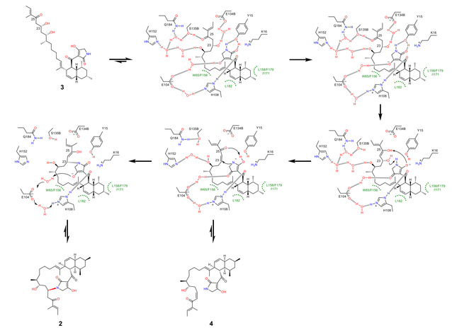 随后结合晶体结构、分子对接及分子动力学模拟,对蛋白活性位点进行了点突变验证。同时,在AvmM-L182A的催化中检测到痕量极不稳定的推测的脱水中间体存在,并最终鉴定其为脱水化合物4