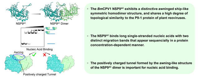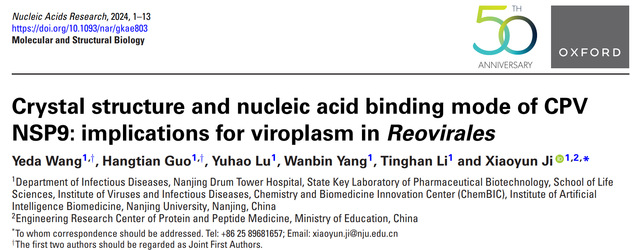 综上,我们使用生物信息学,生物化学和结构生物学等多种手段,解析了常用的研究模型质型多角体病毒NSP9高分辨率晶体结构,发现了一种全新的蛋白-核酸结合模式,为呼肠孤病毒目病毒复制工厂工作机制的理解提供了全新的线索,也为以病毒复制工厂为靶点的呼肠孤病毒目相关药物研发提供理论基础和独特见解。2024年 9月 17日,太阳成集团tyc33455cc籍晓云团队在国际权威期刊《核酸研究》(Nucleic Acids Research)上发表题为“Crystal structure and nucleic acid binding mode of CPV NSP9: implications for viroplasm in Reovirales”的最新研究成果。太阳成集团tyc33455cc博士生王业大和博士后郭航天为论文的共同第一作者,太阳成集团tyc33455cc籍晓云教授为论文的通讯作者。该研究得到了国家自然科学基金,博士后创新基金的资助以及上海同步辐射光源(SSRF)的大力支持,一并致谢。