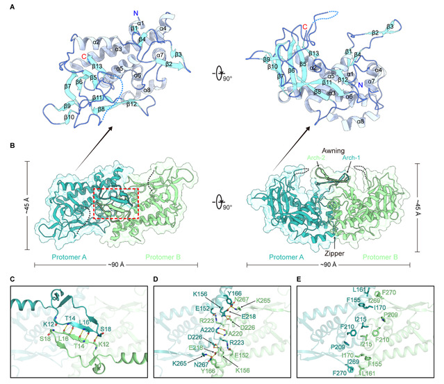 研究团队以呼肠孤病毒目质型多角体病毒(CPV)为研究对象,首先通过间接免疫荧光实验和蛋白质共表达发现NSP9与viroplasm潜在骨架NSP8存在一定的相互作用,表明NSP9在viroplasm中扮演重要角色。NSP9的C末端为潜在的内在高度无序区域(IDR),这一特征使NSP9在纯化过程中表现出显著的不均一性和较大程度的聚集倾向。通过制备均一、稳定的NSP9核心(NSP9ΔC)样品,研究团队获得了高质量的蛋白质晶体,利用X射线晶体衍射技术,成功解析了1.8 Å 的NSP9ΔC同源二聚体晶体结构。NSP9ΔC二聚体呈现独特的“乌篷船”(Awning-ship)形态,且具有高度的对称性。Alphafold3等结构预测未能准确呈现其复杂的局部特征,尤其是其稳定的二聚体界面。基于序列和三维结构的比对没有发现数据库中具有显著结构相似性的蛋白质,但研究团队发现一种感染植物的呼肠孤病毒(MRCV)的非结构蛋白P9-1与NSP9具有相似的拓扑结构特征。此外,尽管两者在整体三维结构上并未展现出显著的相似性,但核心区域的三束α螺旋表现出极高的结构相似度。这一发现提示在呼肠孤病毒目的非结构蛋白中,可能存在一类拓扑结构上高度保守的折叠形式,有可能使它们执行尚未完全了解的共同功能。