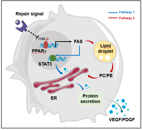 为探讨M2c巨噬细胞在功能调控中的分子基础,本项目研究人员首先利用多种组织损伤中巨噬细胞的单细胞RNA测序(scRNA-seq)数据构建了M2c巨噬细胞Atlas,结果显示:M2c巨噬细胞中脂肪酸合成(FAS)活性持续增强,且主要与组织修复功能密切相关,据此初步建立了脂质生物合成与巨噬细胞极化为M2c表型之间的关联性;其后,研究者构建皮肤全层切除、急性肝脏损伤和肌肉损伤等多种动物模型,并结合细胞与分子免疫学实验、多组学联合分析,对M2c巨噬细胞极化过程中的关键代谢调控节点进行了深入细致的剖析,建立了以PPARg T166磷酸化为核心节点的巨噬细胞FAS功能调控网络。具体为:在受损组织中,修复信号导致巨噬细胞PPARγ T166磷酸化水平降低,从而促进PPARγ与FAS相关基因调节区域结合,最终诱导胞内脂质的生成与积累。细胞中新生脂质可诱导STAT3介导的血小板衍生生长因子(PDGF)、转化生长因子-b(TGF- b)和血管内皮生长因子(VEGF)等产生,以促进血管新生和再上皮化过程。另一方面,新生脂质可合成磷脂以支持内质网扩张,进而为修复蛋白分泌提供胞内支持。在此过程中,运用遗传或小分子抑制PPARg T166磷酸化的手段,可显著促进巨噬细胞的修复功能,进而影响组织再生进程。综上,该研究确定了以PPARg T166磷酸化修饰为核心的代谢重塑是修复型巨噬细胞功能发挥的关键途径。